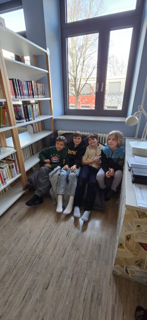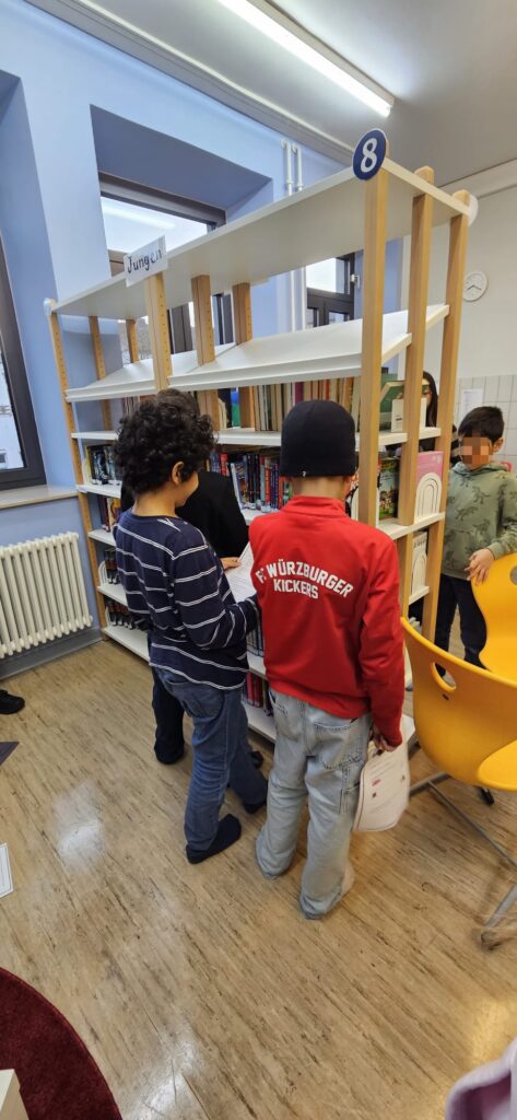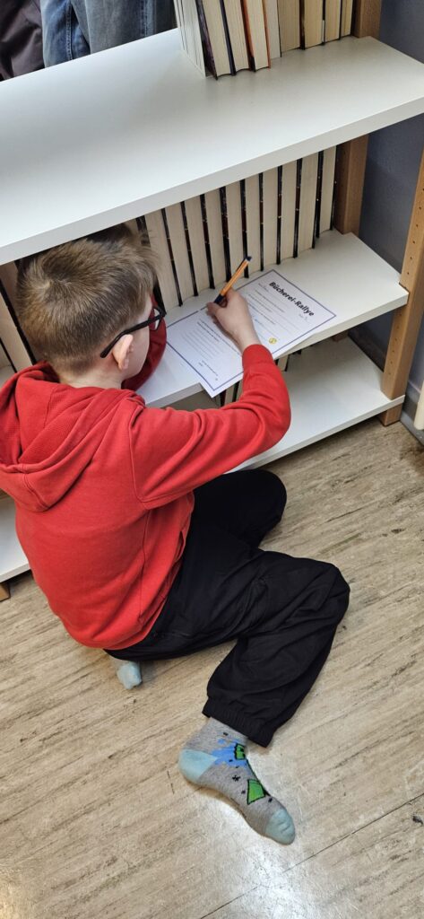Anschließend gingen die Kinder auf eine kleine Rallye durch die Bücherei – begleitet von älteren Schülerinnen aus dem Bücherei-Team, die mit viel Engagement durch die verschiedenen Bereiche führten. So lernten die Kinder spielerisch Aufbau, Angebote und Arbeitsweise der Bücherei kennen.